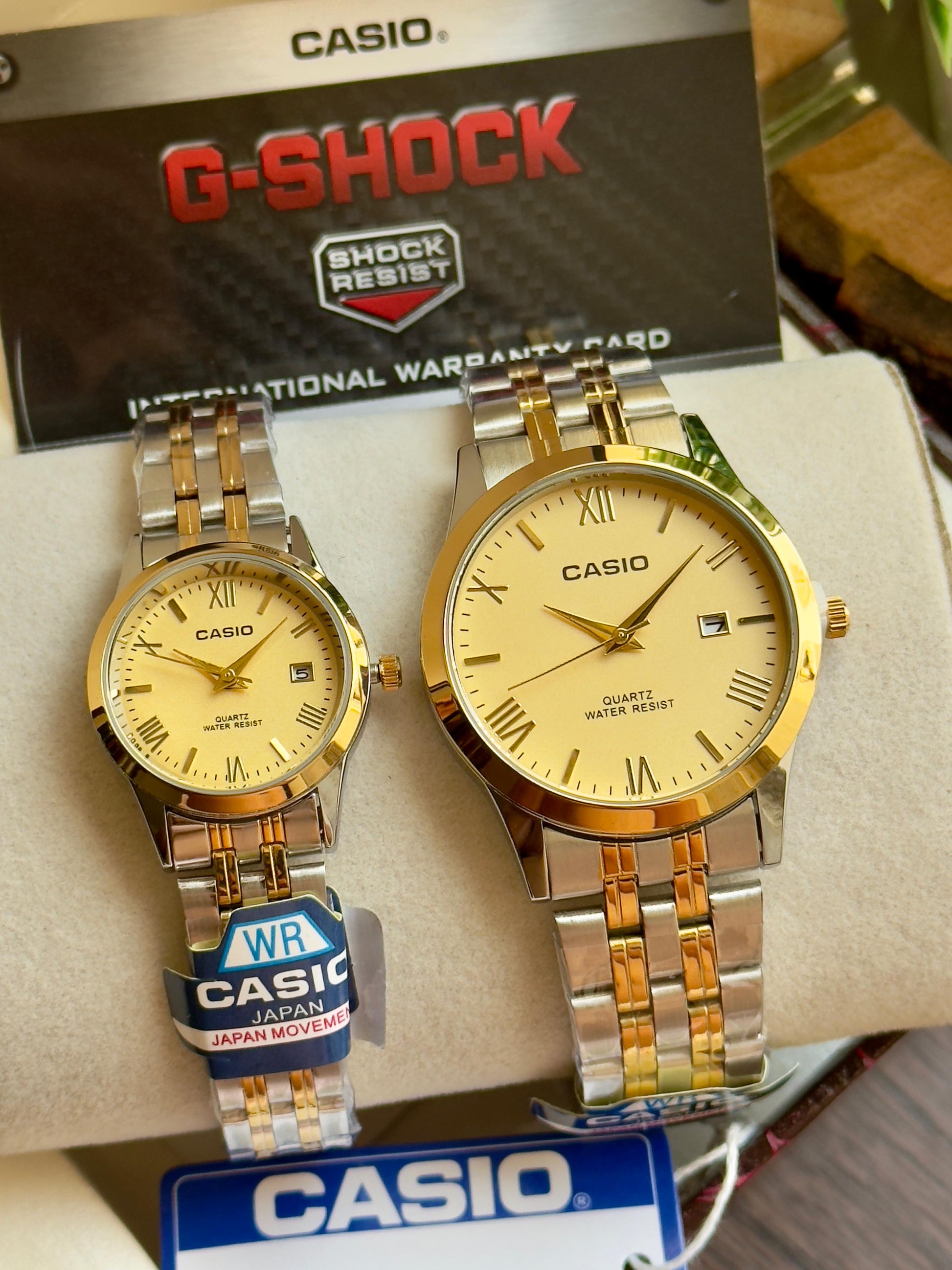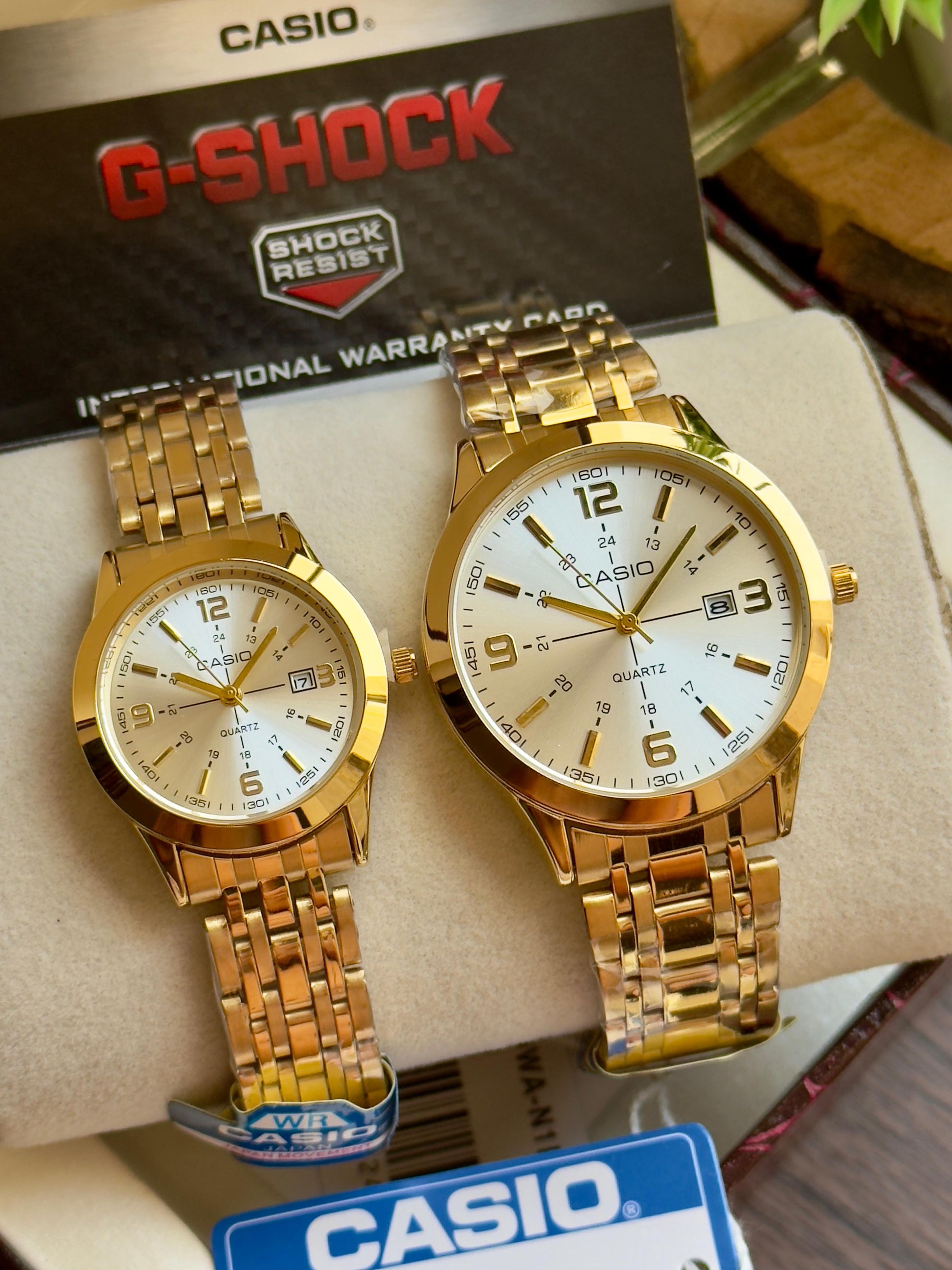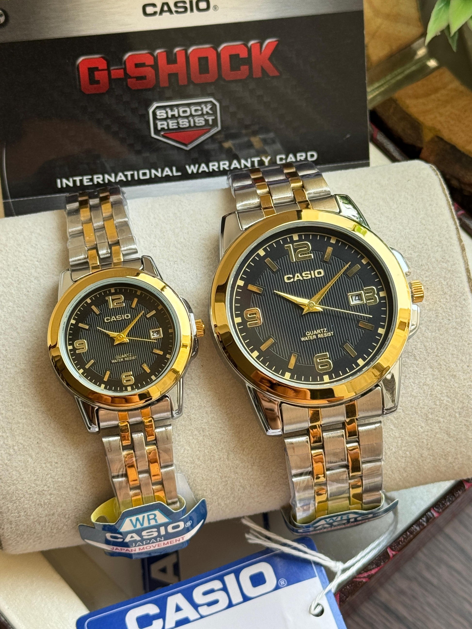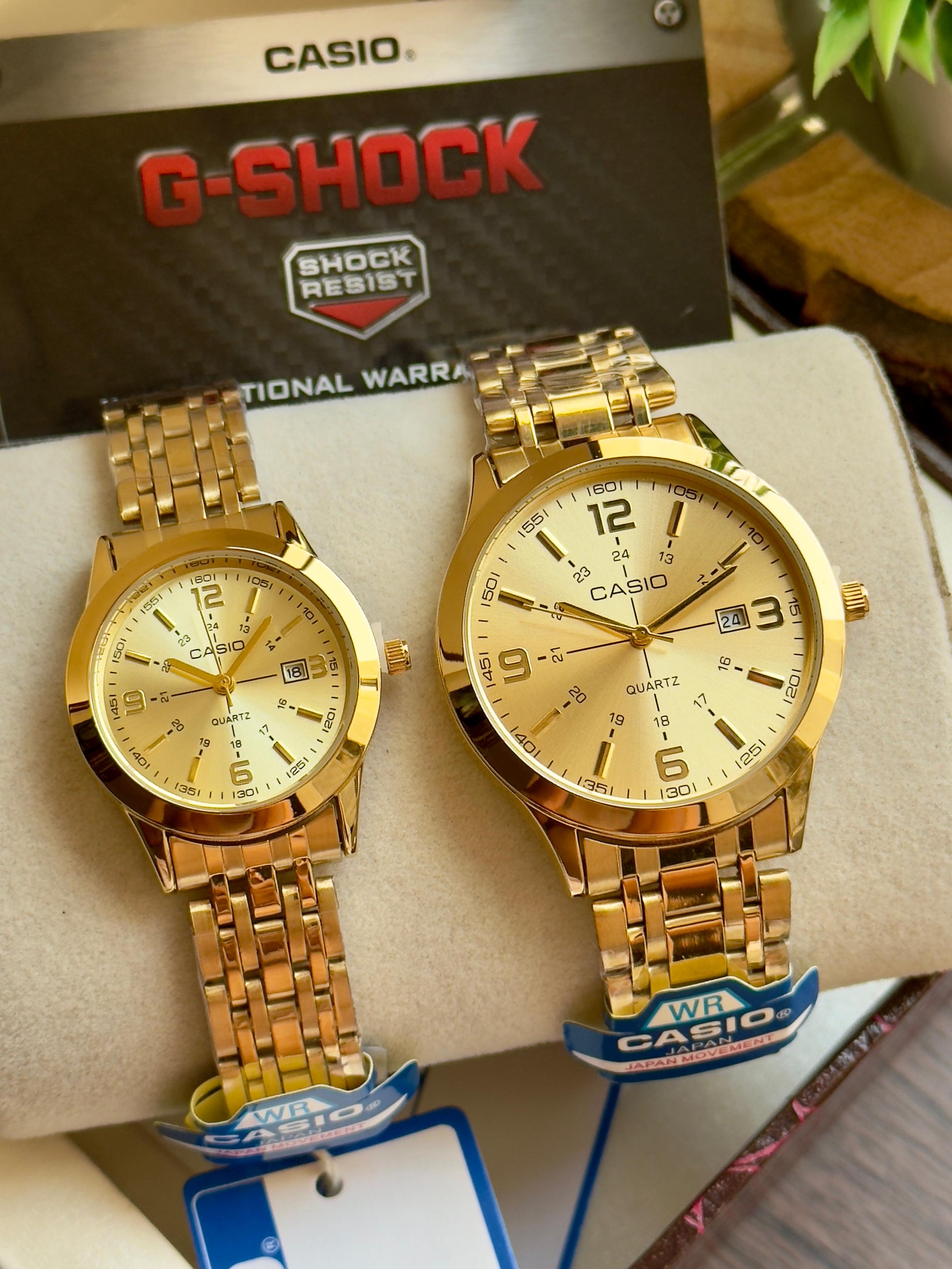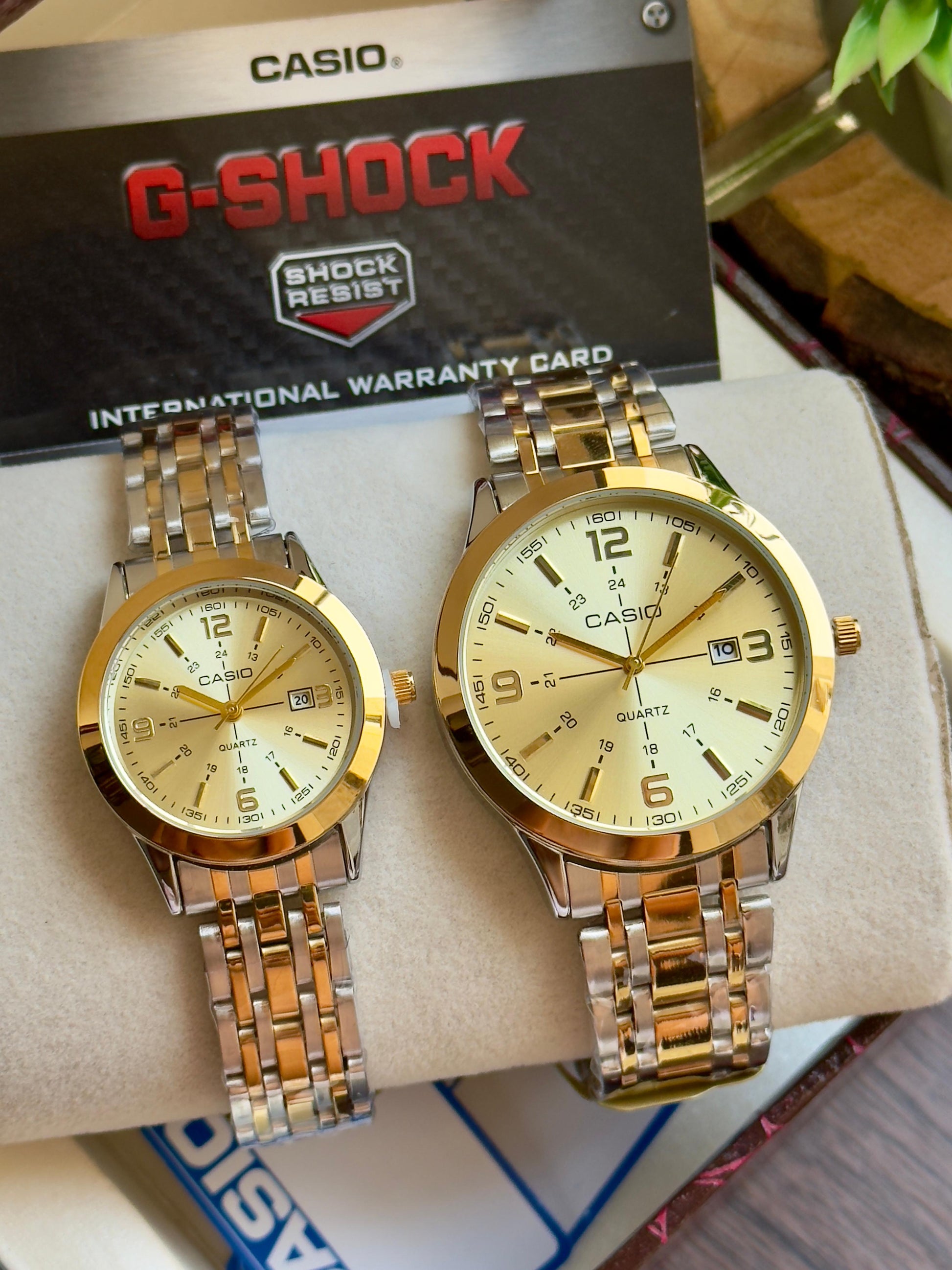 A stunning pair of Casio watches that blend timeless elegance with a touch of luxury in their gold-accented design.