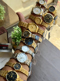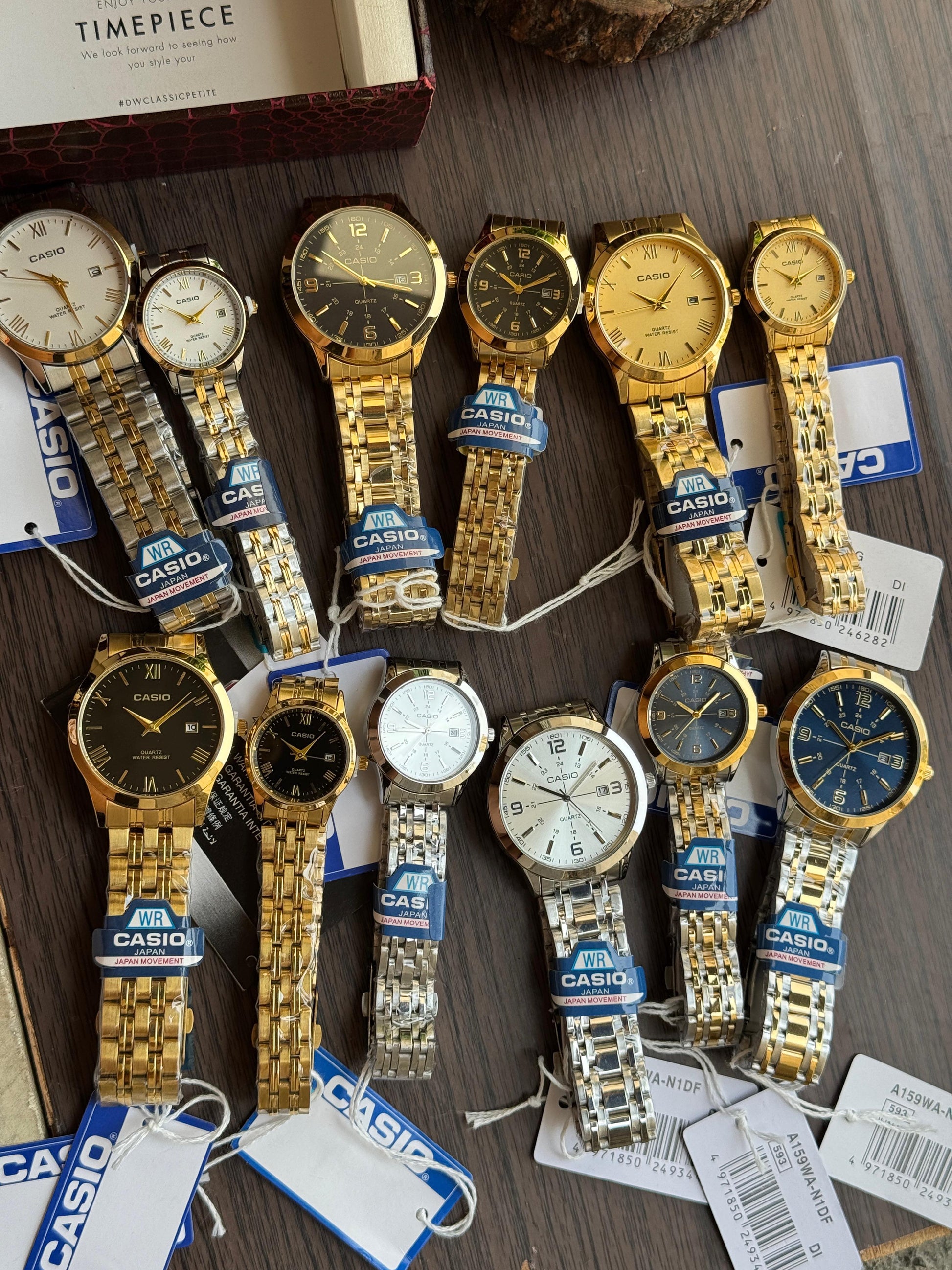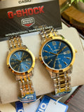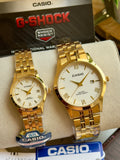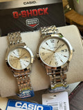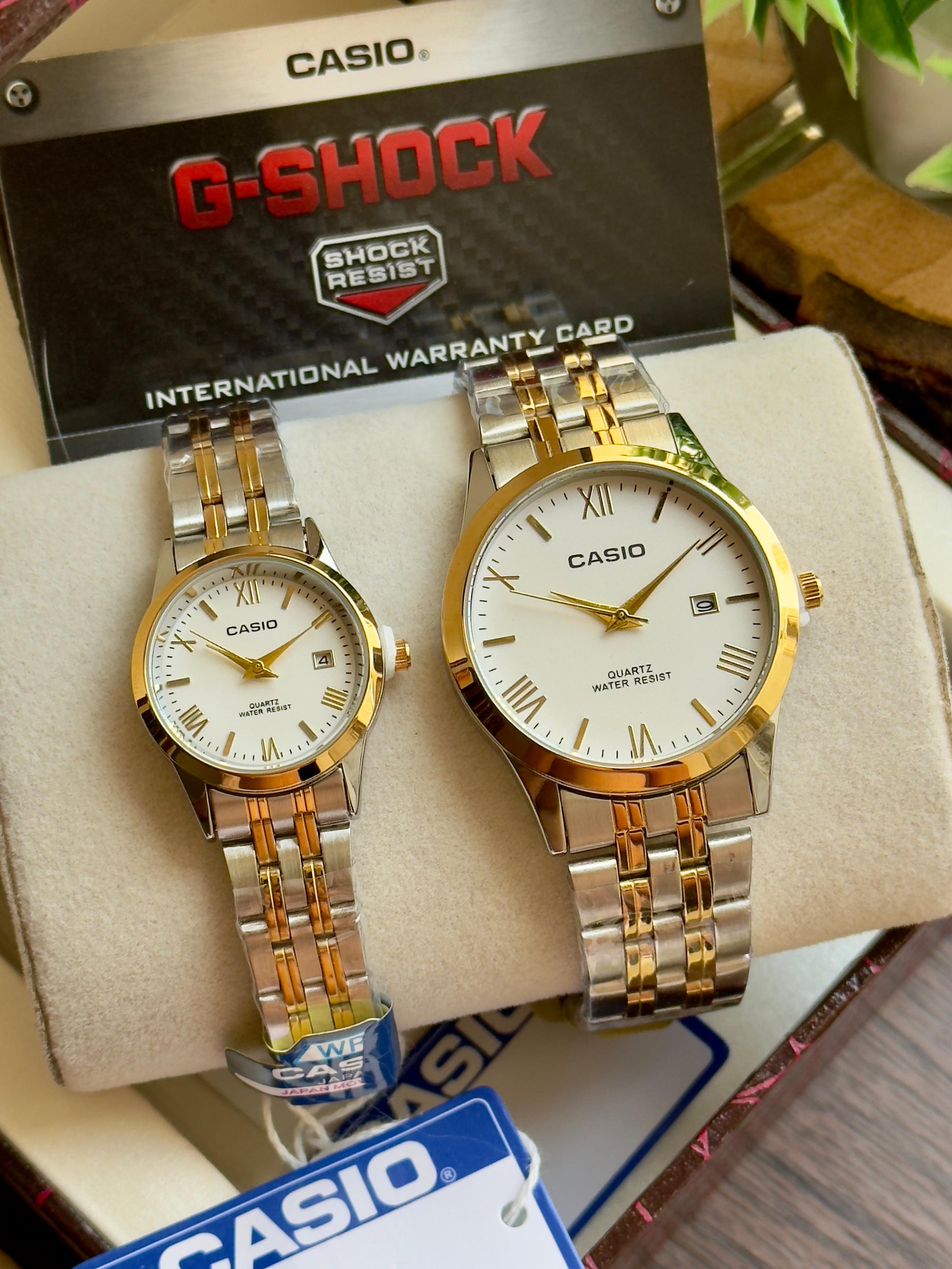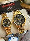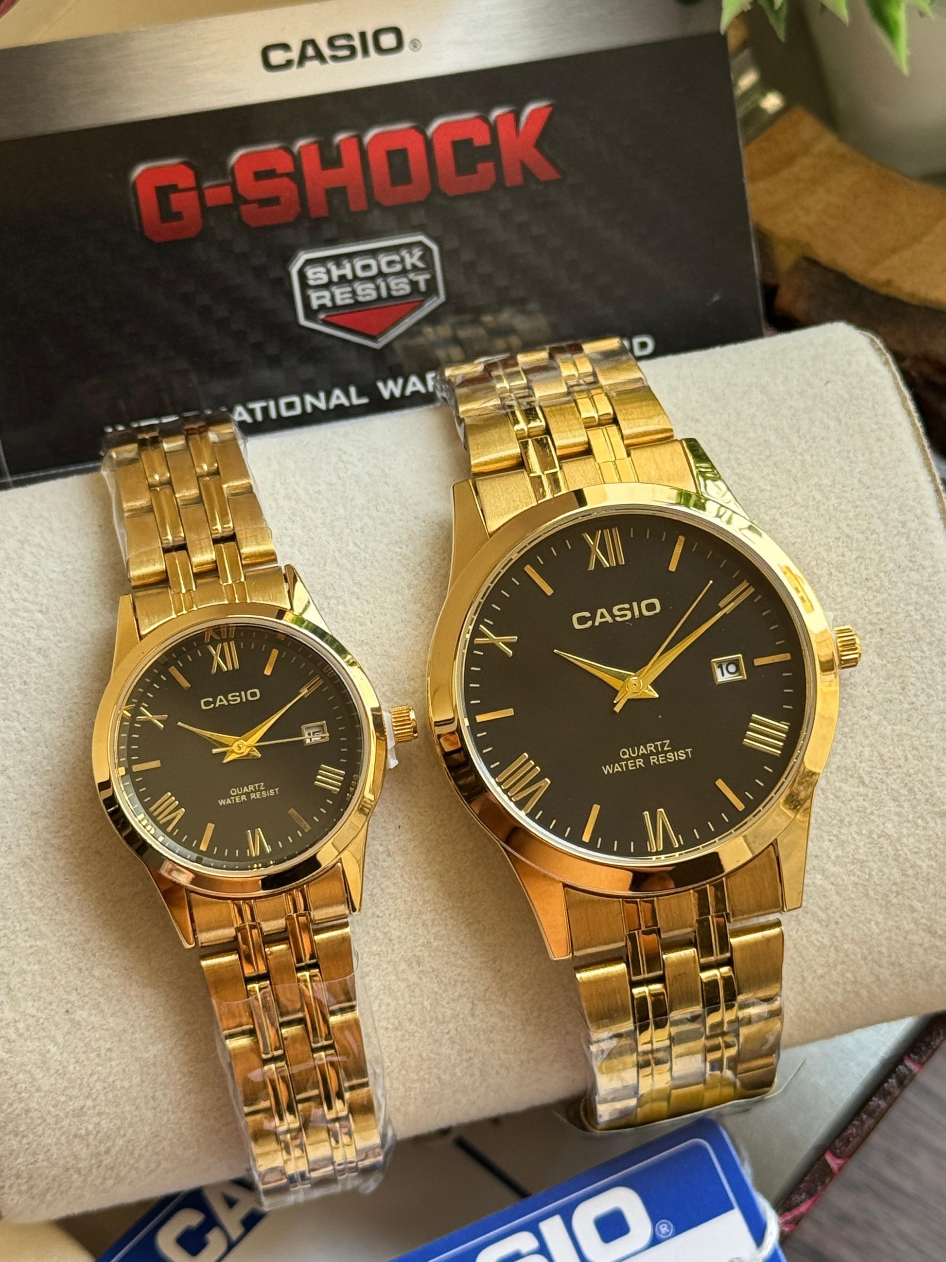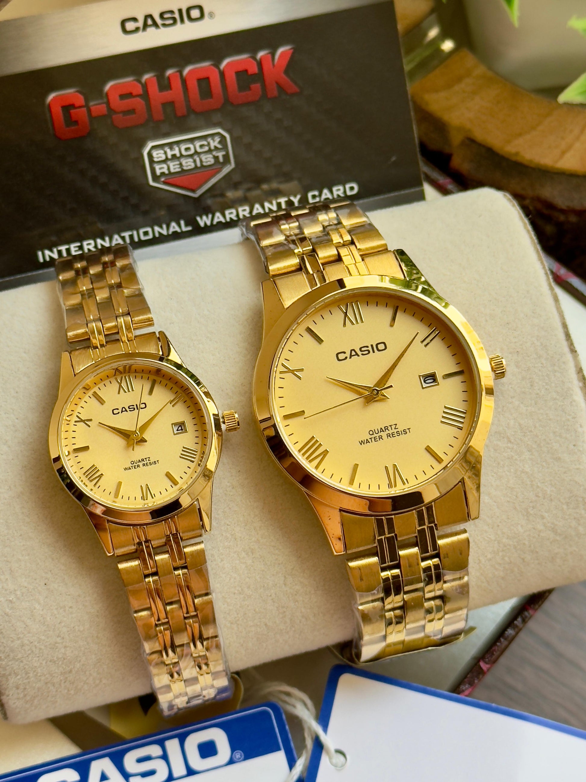 A stunning pair of Casio watches that blend timeless elegance with a touch of luxury in their gold-accented design.